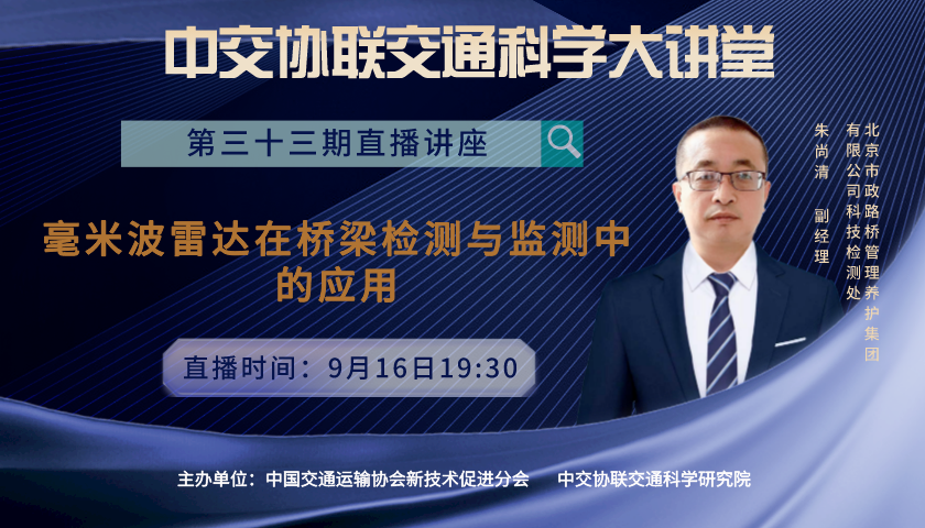 嘉賓介紹 朱尚清,工學(xué)碩士,正高級工程師,北京市政路橋管理養(yǎng)護(hù)集團(tuán)有限公司科技檢測處副經(jīng)理/總工程師。北京市評標(biāo)專家?guī)鞂<遥袊萍籍a(chǎn)業(yè)化促進(jìn)會和交通運輸協(xié)會基礎(chǔ)設(shè)施分會專家委員,中國市政工程協(xié)會質(zhì)量專家,中國工程師聯(lián)合體專業(yè)工程會員,《市政技術(shù)》雜志社審稿專家,北京工業(yè)大學(xué)碩士校外導(dǎo)師,獲得第五屆“北京公路優(yōu)秀工程師”榮譽(yù)稱號。在國家級期刊發(fā)表學(xué)術(shù)論文20多篇,獲得國家發(fā)明專利5項,實用新型專利20余項。主持完成北京市科委重大科研項目3項,北京交通科技項目1項,獲得北京公路學(xué)會科學(xué)進(jìn)步獎2項,獲得上海公路學(xué)會科技進(jìn)步一等獎1項,中國交通運輸協(xié)會科技進(jìn)步一等獎1項,上海土木工程科技進(jìn)步二等獎1項。編制行業(yè)標(biāo)準(zhǔn)一項,團(tuán)體標(biāo)準(zhǔn)兩項;正在編制的團(tuán)體標(biāo)準(zhǔn)三項,地方標(biāo)準(zhǔn)一項。已出版《毫米波雷達(dá)在橋梁檢測與監(jiān)測中的應(yīng)用》和《海洋無人平臺技術(shù)》兩本著作,即將出版《橋梁荷載試驗研究與應(yīng)用》一書。 講座概要 報告題目“毫米波雷達(dá)在橋梁檢測與監(jiān)測中的應(yīng)用”,主要內(nèi)容內(nèi)容包括:毫米波雷達(dá)的測量原理、毫米波雷達(dá)技術(shù)國內(nèi)外研究的現(xiàn)狀、無線分布式毫米波雷達(dá)的特點及操作方法以及毫米波雷達(dá)在索力測試、橋梁靜載試驗、動載測試以及橋梁監(jiān)測方面的應(yīng)用等內(nèi)容。報告中對毫米波雷達(dá)技術(shù)在橋梁中的應(yīng)用進(jìn)行了系統(tǒng)的總結(jié)與梳理,介紹了新技術(shù)在橋梁中各種應(yīng)用場景的典型的應(yīng)用案例,最后對毫米波雷達(dá)技術(shù)未來在橋梁以及其它行業(yè)中的應(yīng)用前景進(jìn)行了展望。2023-09-25